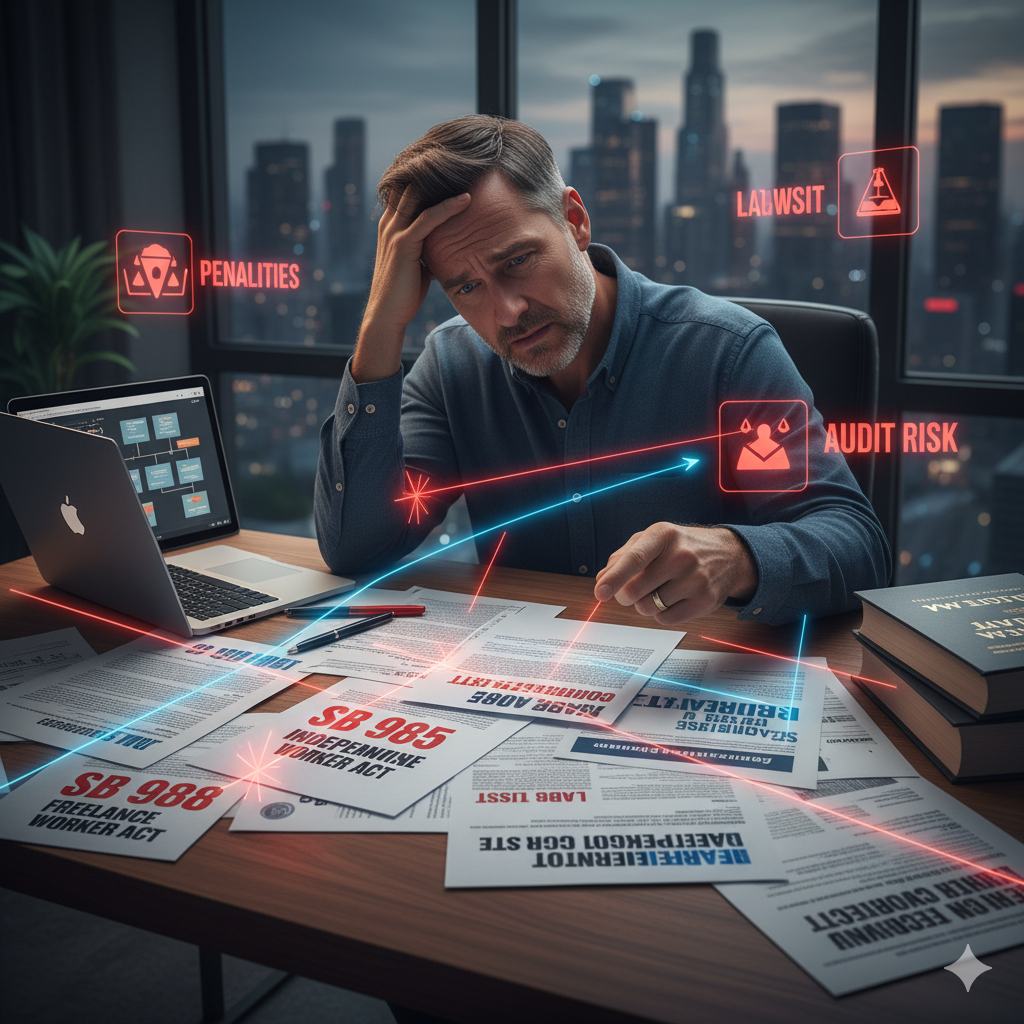 For example, a company might fail to pay a freelance writer’s $1,500 invoice within the 30-day statutory deadline, a clear violation of SB 988. The writer’s attorney files a suit seeking double damages ($3,000) plus attorney’s fees under the FWPA. During discovery for this seemingly minor claim, the attorney requests all emails and project management records. These communications reveal that the hiring manager dictated the writer’s work hours, required the use of proprietary company software for submissions, and provided daily, step-by-step instructions on content—all classic evidence of control that violates Part A of the ABC test. The attorney then amends the complaint to add a cause of action for willful misclassification. The legal exposure instantly metastasizes from a few thousand dollars to a potential six-figure liability, including claims for back wages, overtime, meal and rest break penalties, unreimbursed business expenses, and PAGA penalties. The initial SB 988 violation served as the key that unlocked the door to the much larger misclassification claim.